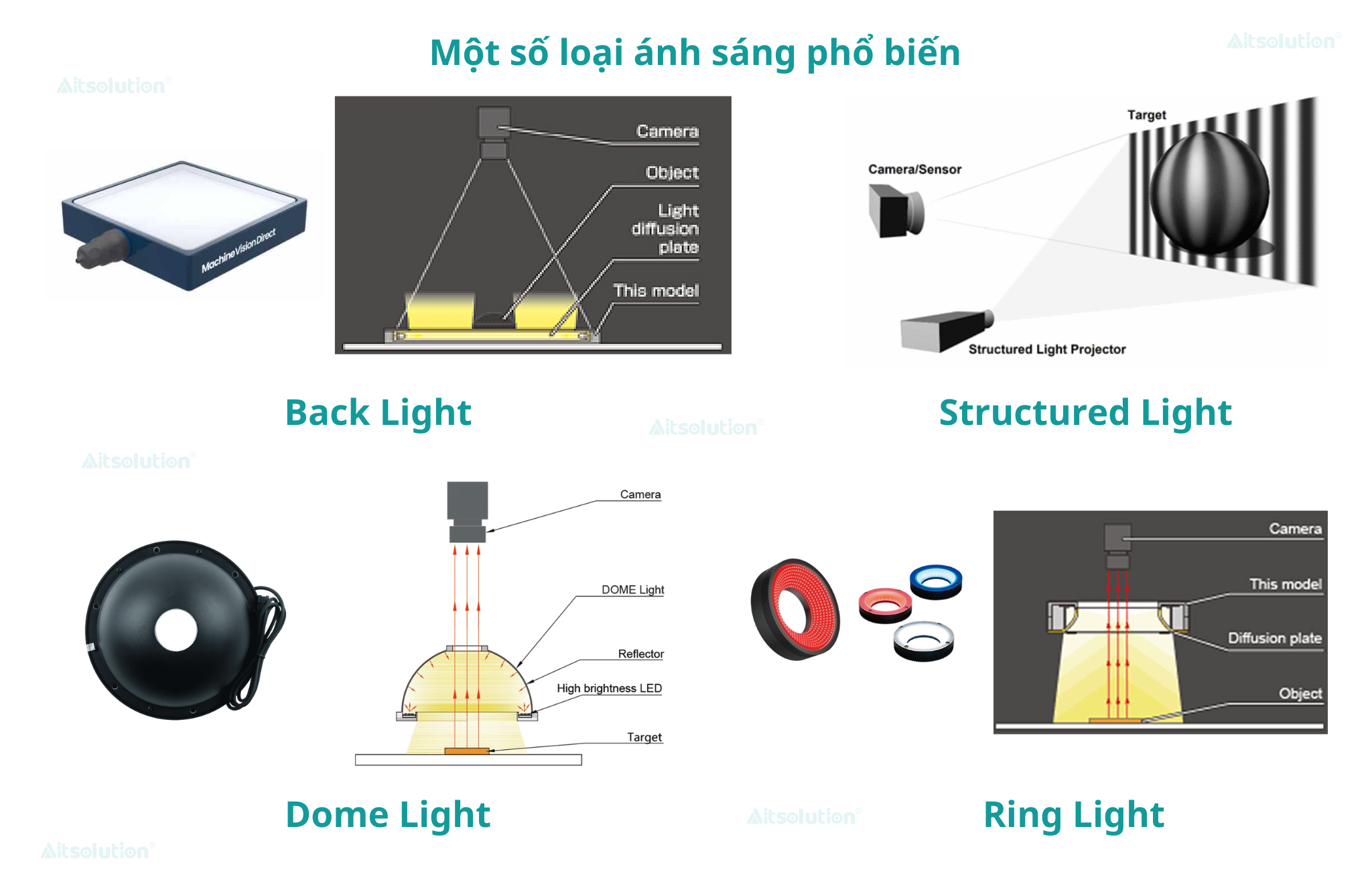 Ánh sáng là yếu tố quan trọng giúp hệ thống Vision nhận diện sản phẩm chính xác. Hệ thống chiếu sáng giúp: tăng độ tương phản hình ảnh, giảm nhiễu và cải thiện độ chính xác nhận diện. Một số loại ánh sáng phổ biến: